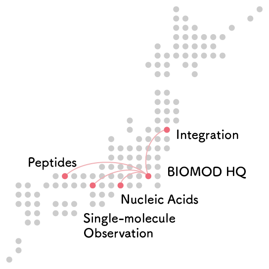 近年の化学・生物学・情報学の発展に伴い,生体分子のde novoデザインやリデザイン,そしてこれらを利用した分子デバイスや分子システム構築が盛んになっています.本研究所では,創薬分野に代表される将来の革新的医療技術をはじめ,環境・エネルギー・材料など多彩な分野におけるブレイクスルーが期待されるこの新興領域において,研究・教育・産学連携を広く支援する活動を通じ,関連技術の社会実装を目指します.